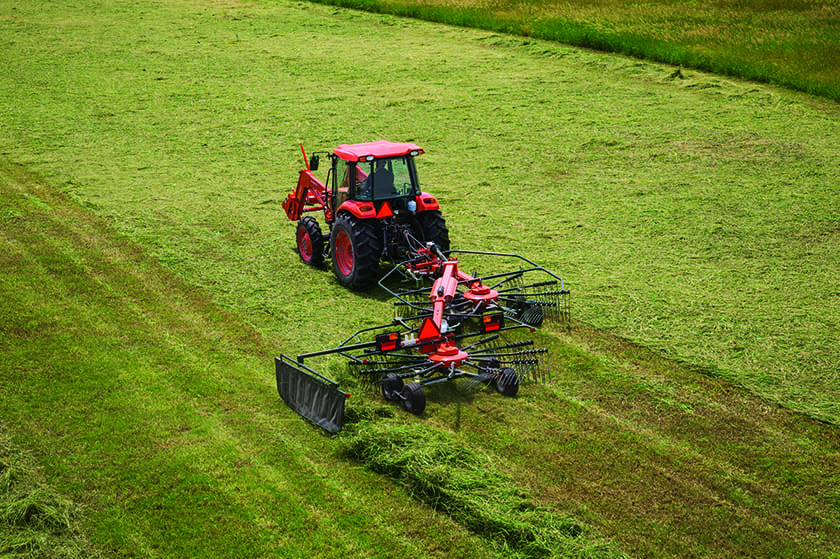 The RA2071T EVO has a working width of up to 23’3″ in double swath position and has features like the Kubota TerraLink flex system and curved tine arms. Independently working twin rotors provide the option to rake the crop into a single swath or two individual swaths, giving you choices for optimum dry time. The high ground clearance makes headland turning no problem over existing swaths, and the reduced width makes transportation easy.