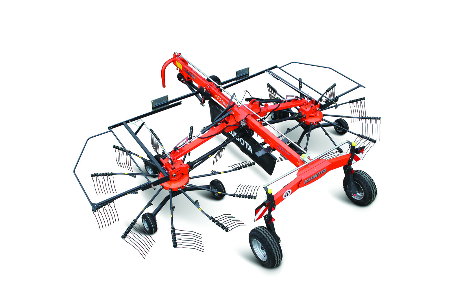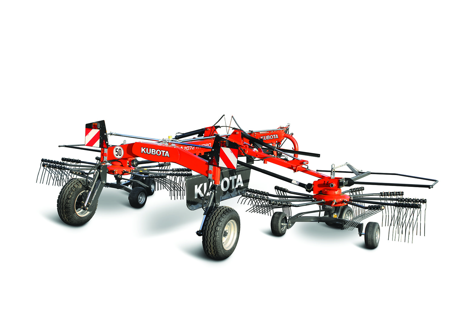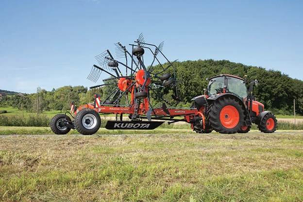 The Kubota RA2072 Center Delivery Rake gives you professional and precise haymaking with the ability to hydraulically adjust your working widths. A TerraLink Quattro system provides increased flexibility and matches ground contour to give you an exceptional raking performance, and the working width of 20’ 4” to 23’ 7” makes sure you’re going to maximize your capability.