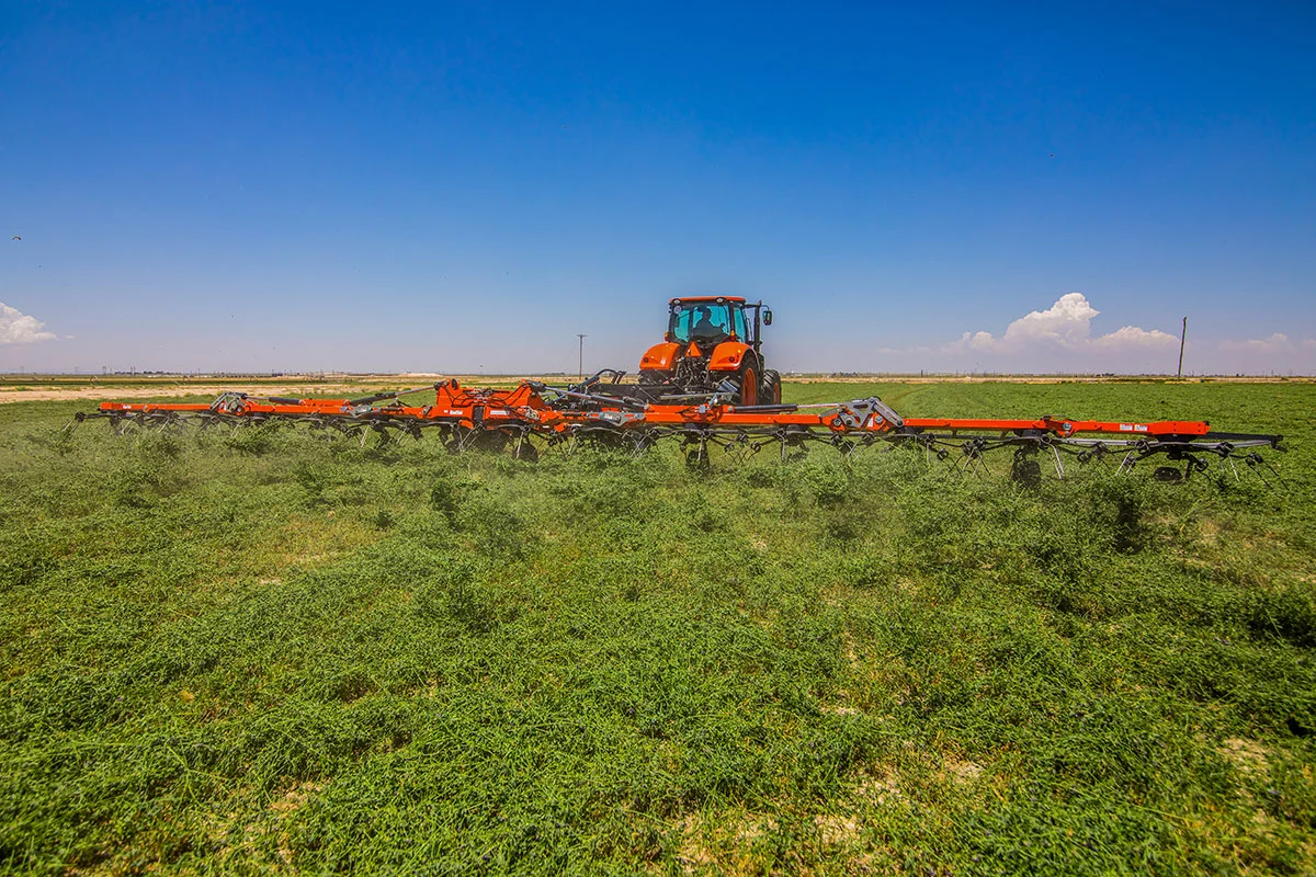 The premier tedder experience is easily found in the Kubota TE12513C and its 43’11” working width makes haymaking efficient! The tedder’s Super-C tines spread the crop in an inverted fashion, meaning the lower crop is placed on top, providing you with an even dry down. Kubota’s commitment to durability is showcased in the tedder’s rotor gearbox and chassis, and with a transport width of just 9’8” you’ll swear the TE12513C is your new best friend.